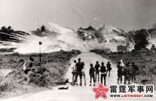 1972年6月8日,越南AF“空中袭击者”轰炸机投下的凝固汽油和胶化白磷炸弹在展鹏郊外高台教寺前居民区内爆炸。前景:越南士兵、多个国际新闻组织的新闻和摄影记者目睹爆炸的现场。在爆炸的中心,展鹏高台教寺塔清晰可辨。